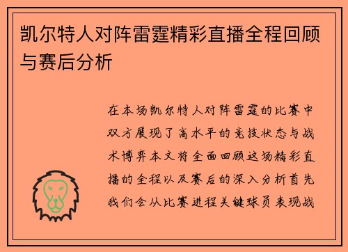凯尔特人对阵雷霆精彩直播全程回顾与赛后分析
